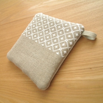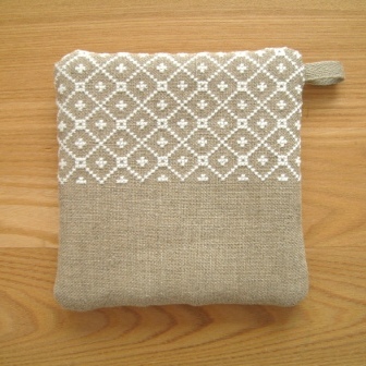 模様を刺繍したリネンで、ポットマットをつくりました。